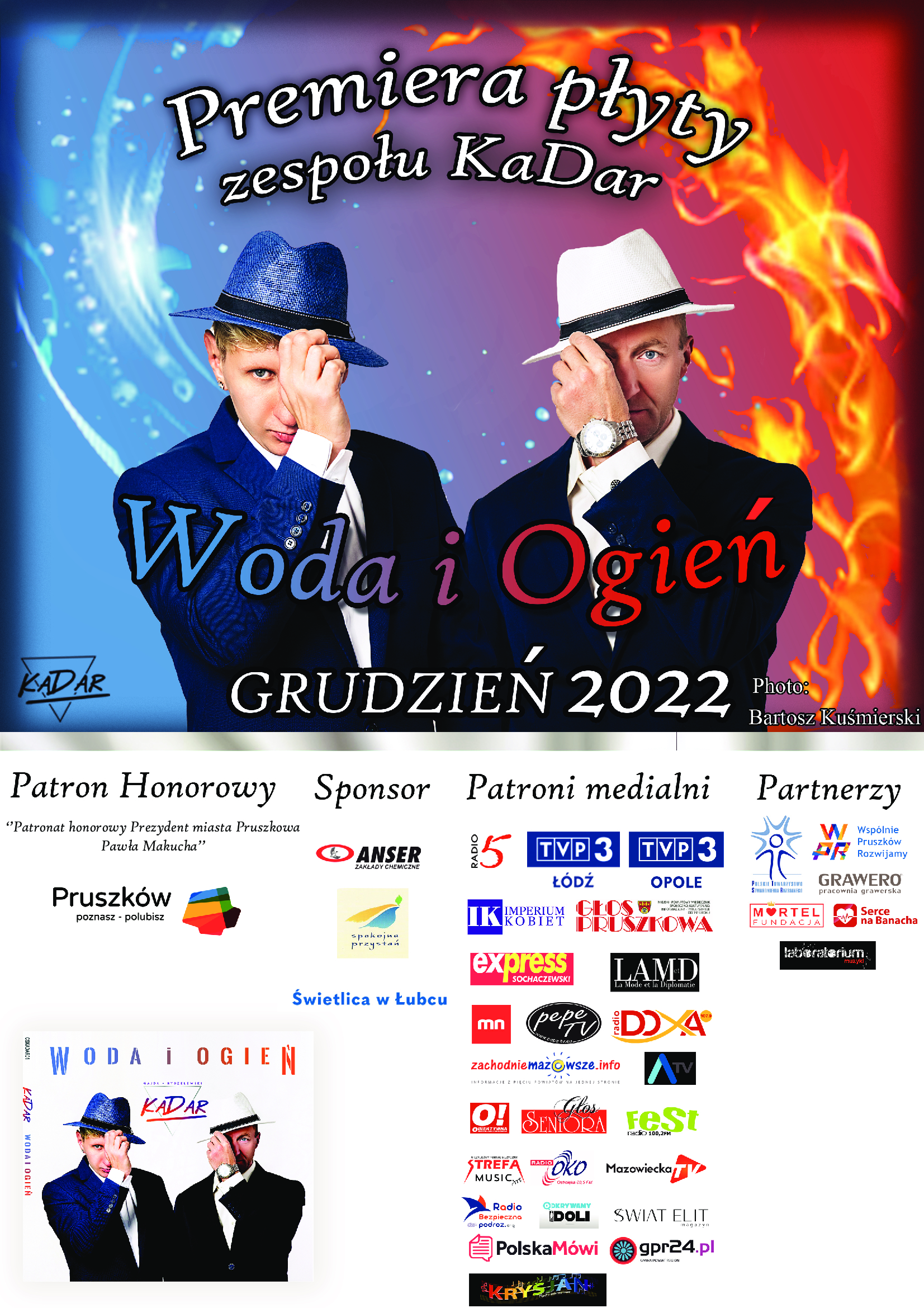 Przedstawiamy nasz najnowszy projekt płytowy „Tańczmy” – Dariusza Gajdy i Krzysztofa Rydzelewskiego (KaDar) z dwunastoma utworami, nawiązującymi stylistycznie do lat – 80 tych ubiegłego wieku, ze współczesnym uniwersalnym przekazem dla słuchacza. Jest to podróż muzyczna łącząca tamten klimat muzyczny ze zrozumiałym przekazem tekstowym, z którym każdy może się utożsamić , w nawiązaniu do dwunastu miesięcy roku. Tak, jak każdy miesiąc jest inny, każdy utwór ma swój inny przekaz i temperament. Jest trochę tanecznie, gdyż chcieliśmy połączyć to, co nagrywaliśmy na poprzednim albumie „Woda i ogień” , ale już w odmienionej estetyce i w innym stylu. Jest to dalej muzyka elektroniczna, ale dodatkowo saksofon i skrzypce nadają utworom bardziej żywego przekazu i innego bardziej ambitnego stylu, wzorcami sięgającymi do najlepszych wykonawców oraz zespołów tamtej epoki. Na skrzypcach zagrała YLO Violin (Ilona Perz-Golka) oraz Michał Borowski – saksofon. Płycie będzie patronować wiele instytucji oraz mediów o zasięgu międzynarodowym. Płytę dedykujemy wybitnym artystom scen polskich, zasłużonym dla Kultury i Dziedzictwa Narodowego Polski, a w szczególności Renie Rolskiej oraz Jerzemu Połomskiemu , z którymi mieliśmy przyjemność współpracować w przeszłości. A także jednej z najdłużej występujących gwiazd polskiej estrady – Sławie Przybylskiej, z którą współpracujemy od marca 2023 do dziś. Jednym z najważniejszych partnerów płyty jest „Fundacja imienia Sławy Przybylskiej Sława” za zgodą samej artystki. Płytę dedykujemy naszym sympatykom, wiernym fanom oraz wszystkim , którzy wspierają nas od lat.